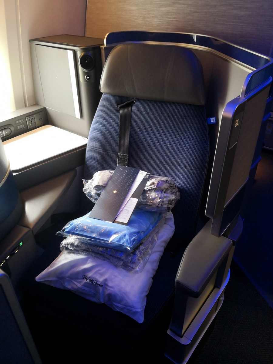 サンフランシスコでの搭乗時のシート。枕も布団もありますよ。